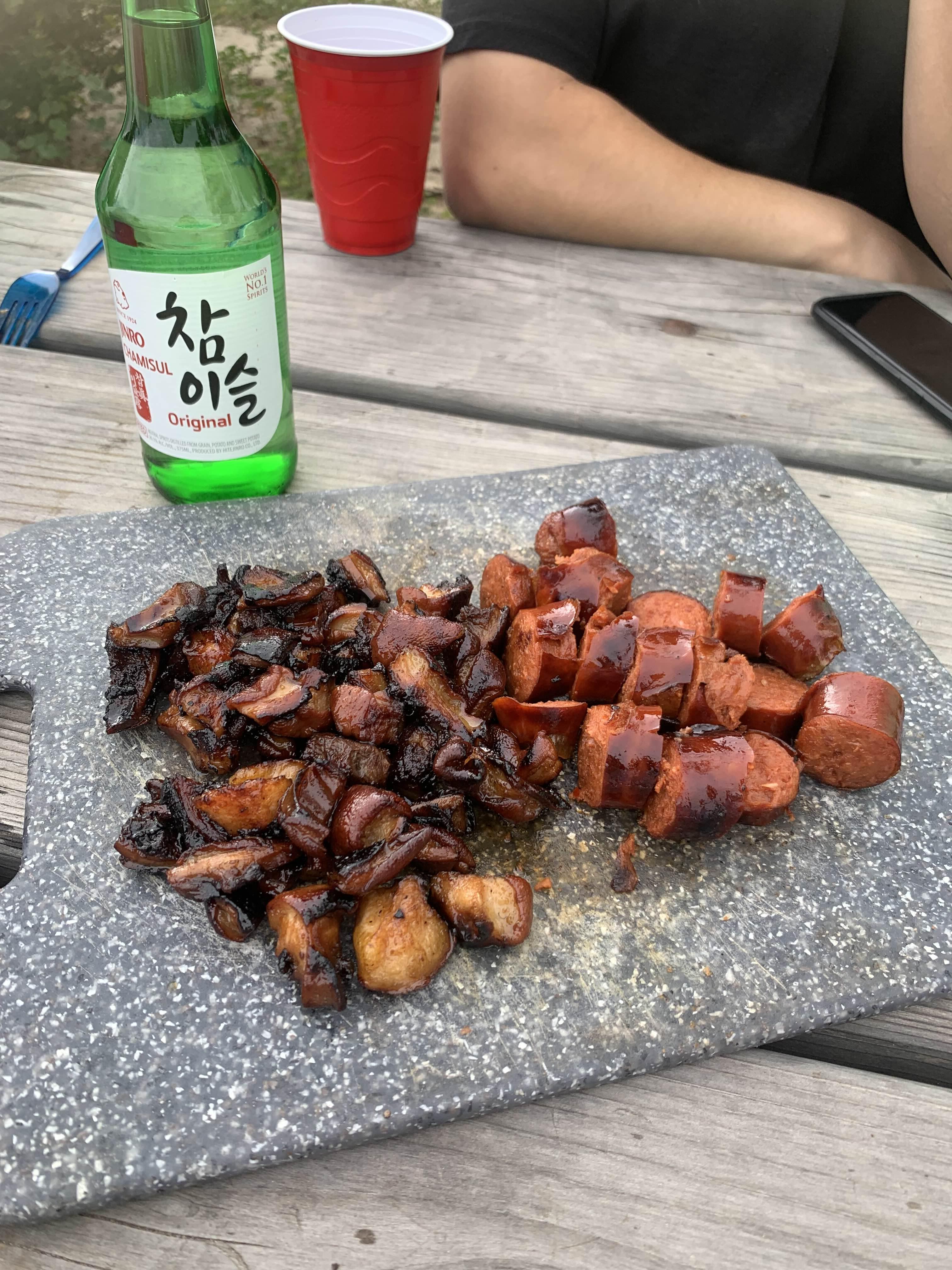 소세지도 가져왔습니다. 아주 통통한 놈으로 골라왔어요. 칼집을 안냈더니 좀 터지긴 했지만 아주 소세지 속이 실해서 육즙이 가득하네요. 그리고 한국마트를 갔는데 간장에 절여진 막창을 팔더라구요? 바로 카트로 넣어줬죠. 이렇게 숯불에 구워서 먹으니 진짜 뭐 맛이 없는 게 없는 것 같아요. 막창은 간장에 설탕이 많이 들어갔는지 좀 많이 탔지만 먹을 때 적당히 탄 부분은 빼서 쫄깃쫄깃하게 아주 잘 먹었습니다.